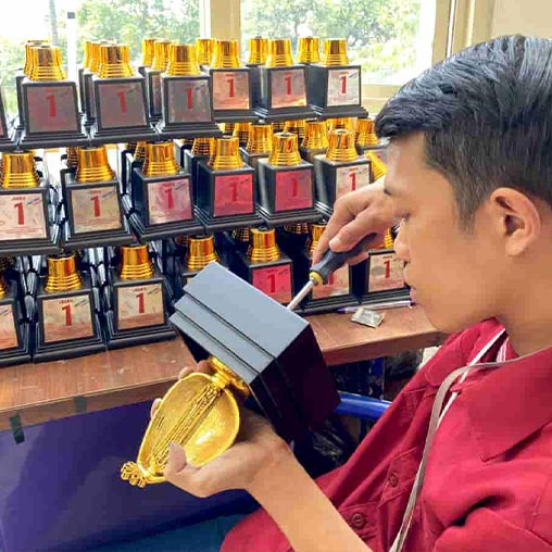 Dalam proses produksi plakat Surabaya, kami mengintegrasikan metode tradisional dan teknologi modern guna menciptakan produk yang unggul, penuh karakter, dan bernilai seni tinggi. Sentuhan khas seperti ukiran tangan atau elemen budaya lokal memberikan nuansa otentik, sementara penggunaan peralatan canggih seperti mesin potong presisi dan laser engraving memastikan hasil yang detail, rapi, dan konsisten di setiap plakat yang kami buat.